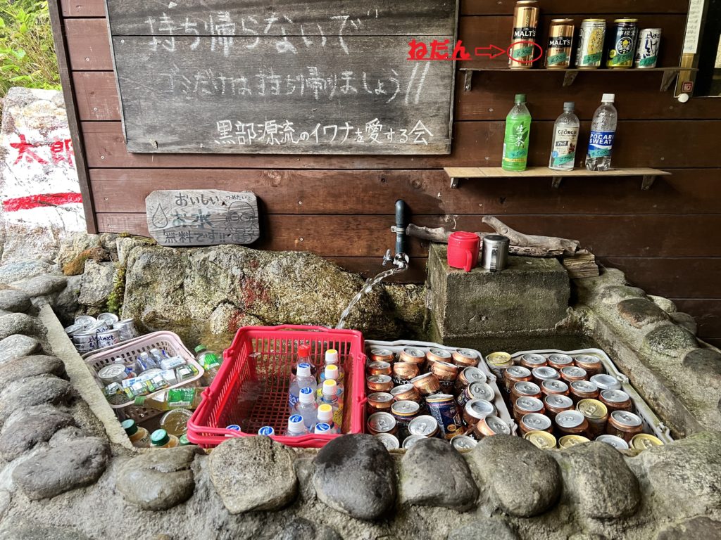 入り口前、清流を利用したクーラーボックスで冷やされる飲み物が目を引きます。