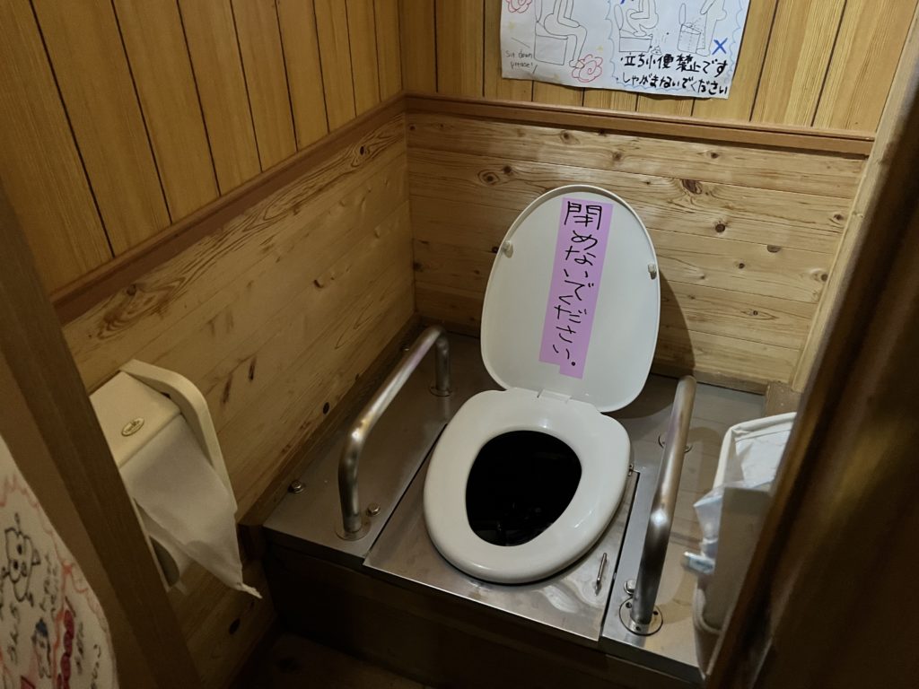木の香りが漂うバイオトイレ。スイッチを押すと回転して汚物処理をしてくれる仕組みとなっています。使用数が多いと処理が追い付かなくなり、機能しなくなることもしばしばあるようです。