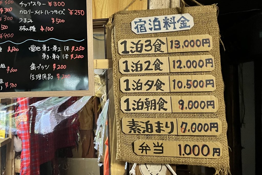 1泊2食¥12,000 - 夕食¥3,500 朝食¥2,000 弁当¥1,000