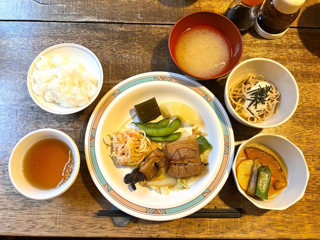 富山の名物「カジキマグロ(さす)の昆布締め」が添えられていました。とろろそばもgood!