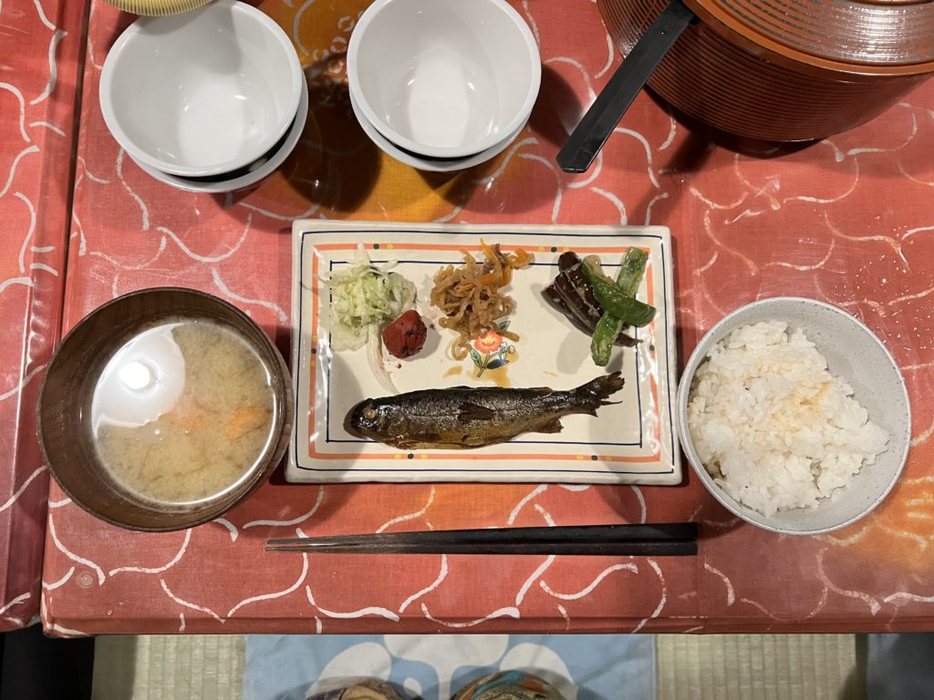 精進料理のような朝ごはん。ごはんのおこげに味わいを感じます。