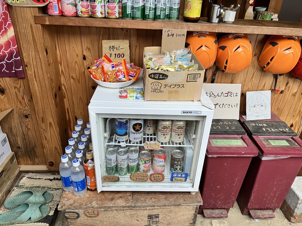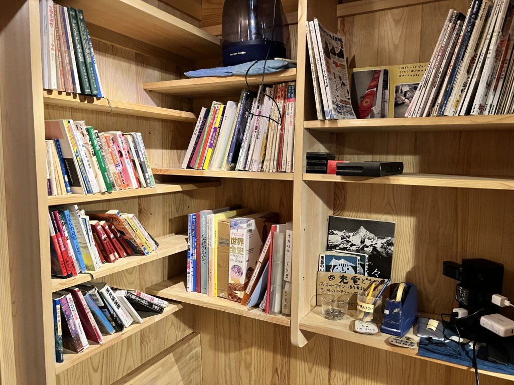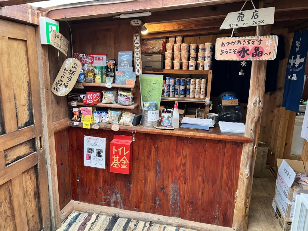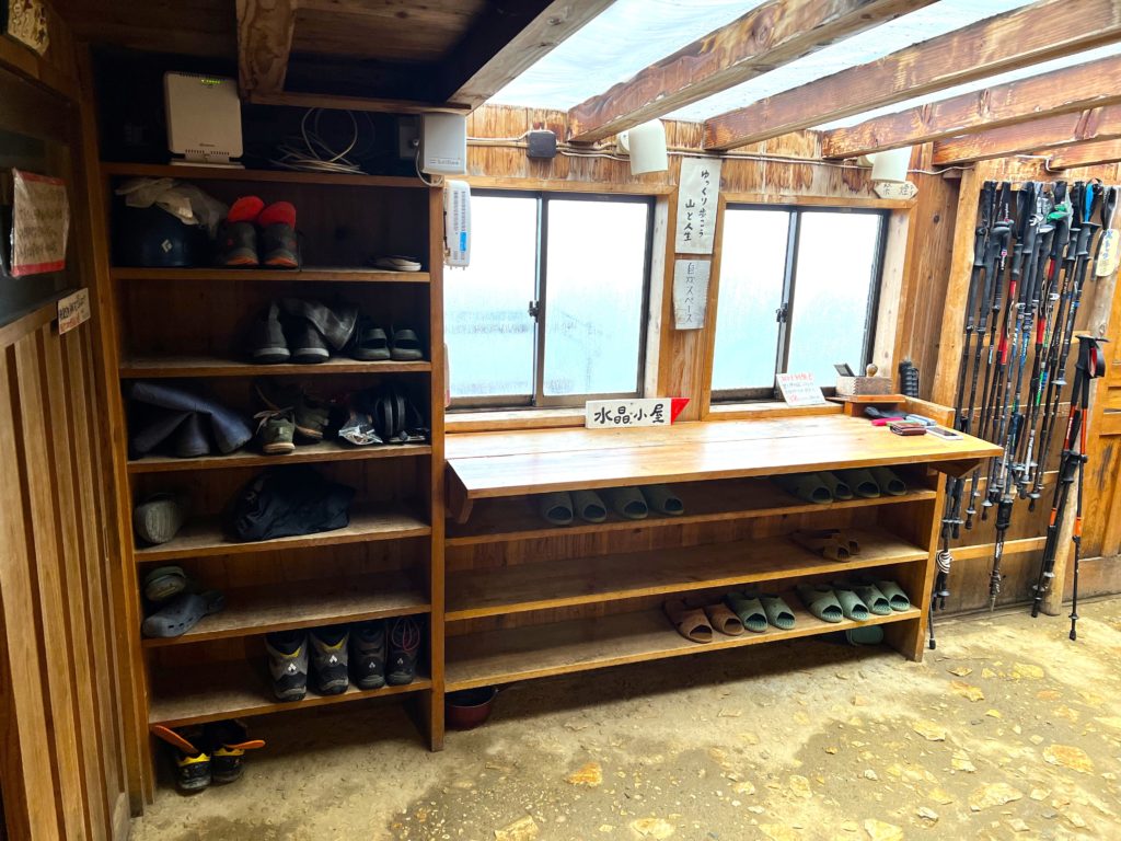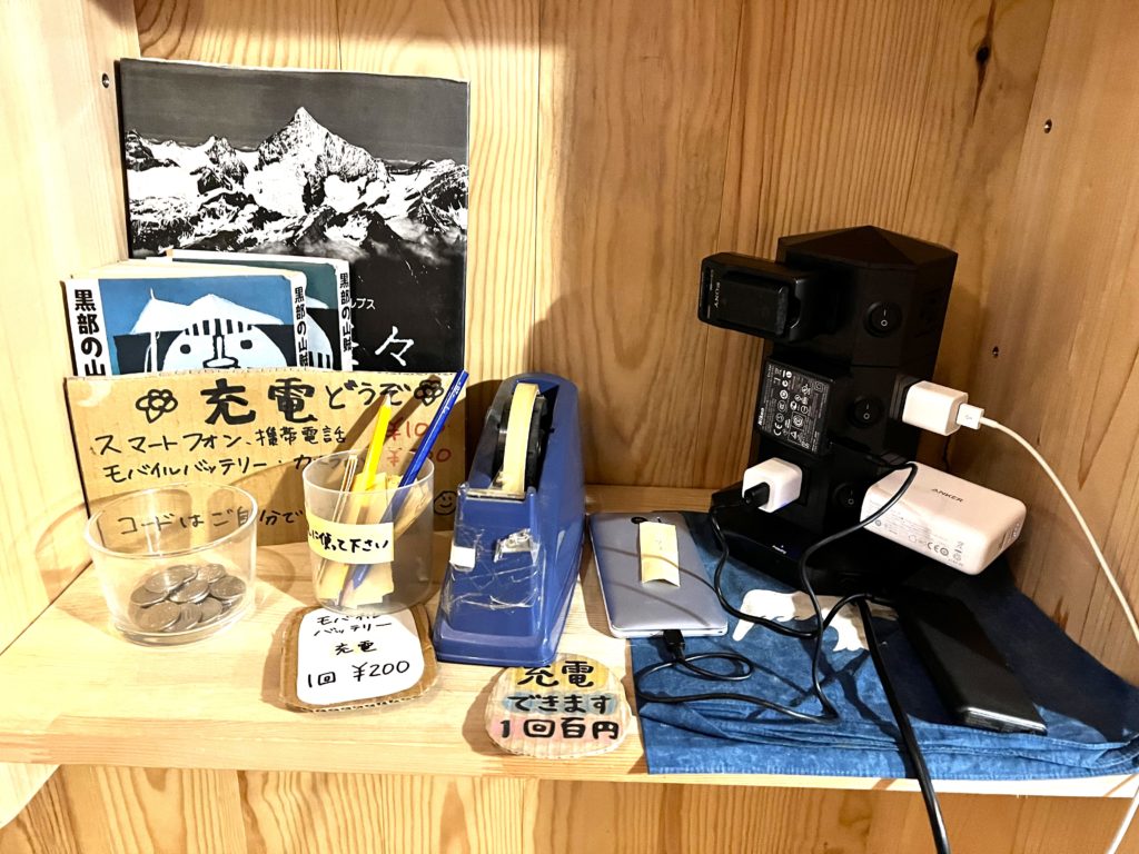 小さな山小屋なので、共用スペースは玄関あがってすぐのこちらだけ。売店・給水所・充電器・書籍、必要なものは全部この辺りににまとまっているので、みんながここに集まります。
