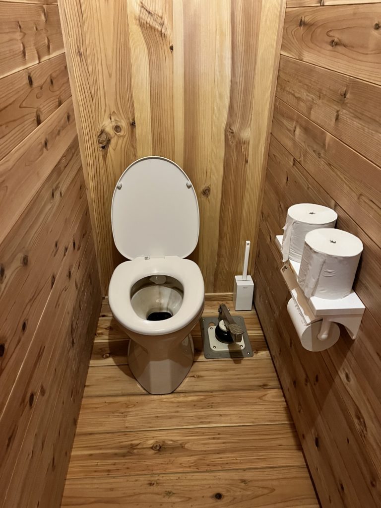 こちらのバイオトイレは、処理水を利用しており使用後は足元のポンプを数回踏んで流す水洗式です。