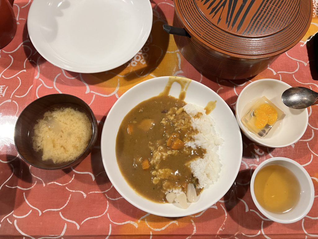 夜ごはんのカレーは、食べ放題。自分で好きなだけよそって食べることができます。なので、盛付がちょっと汚いところも勘弁です(;^ω^)