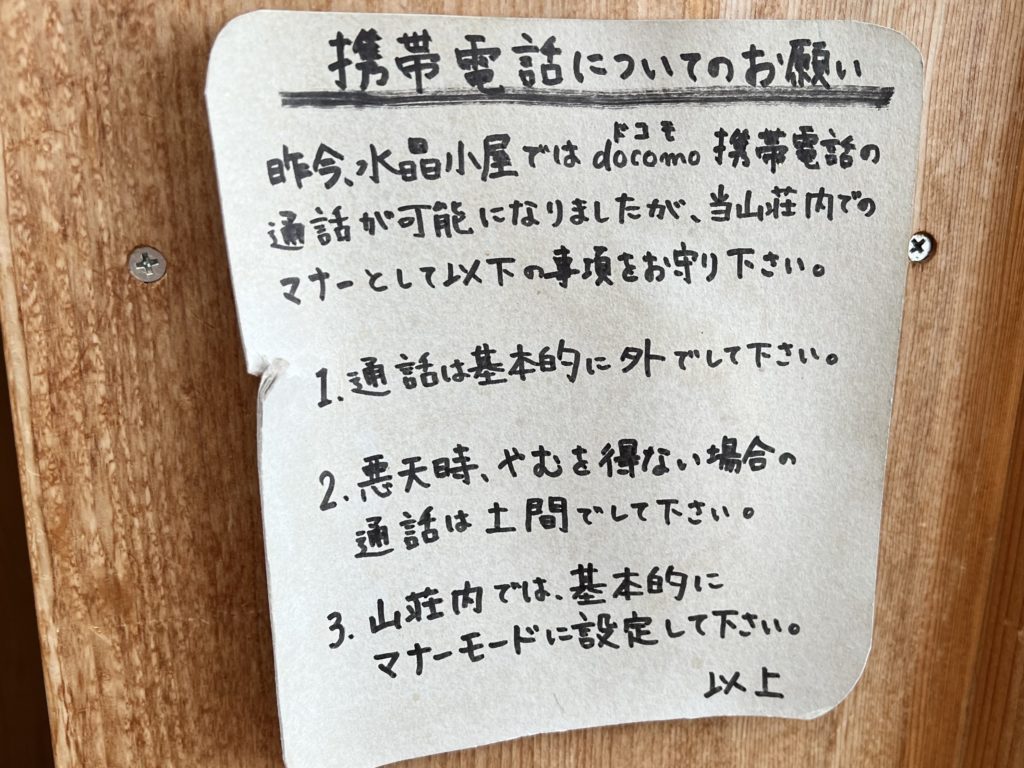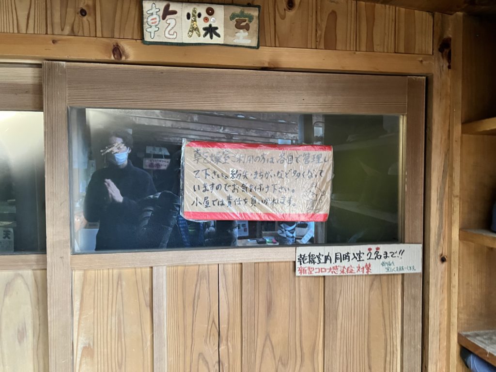 厳しい風雪を耐え抜き辛抱強さを感じる表札。その隣の引き戸を開ける登山者たちは、吹き荒れる強風の中、やっとたどり着けた安心感から皆一様にホッとした表情を見せていました。