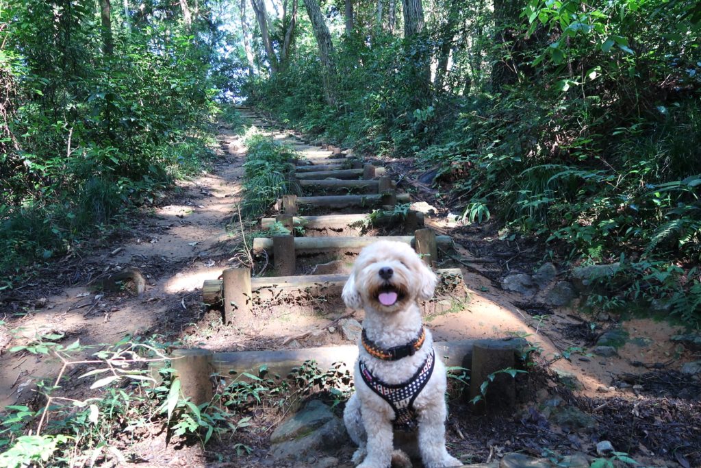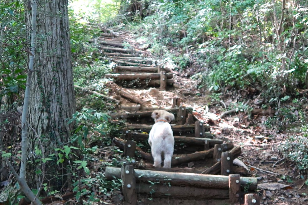 これまで途中に激しいアップダウンはほぼなく、ずっとゆるやかなハイキングコースでしたが、ここに来て長い登りの木段!