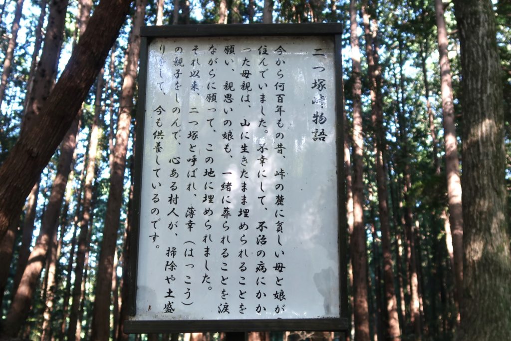 遠い昔、この地に生きたまま埋められることを望んだ貧しい母子の物語がこの峠の名前の由来となっています。