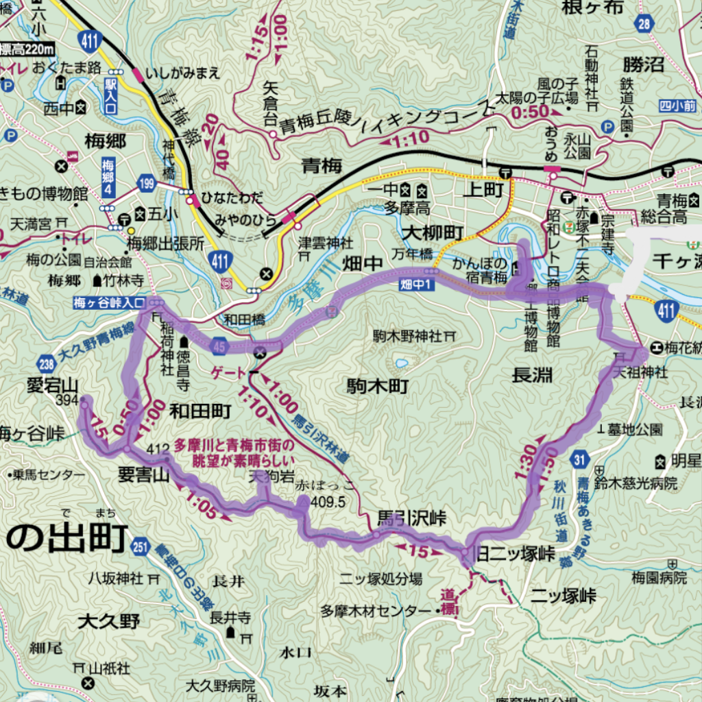 ※一般の車道 都道45号線(吉野街道)を往路15分 復路1時間ほど歩きます。