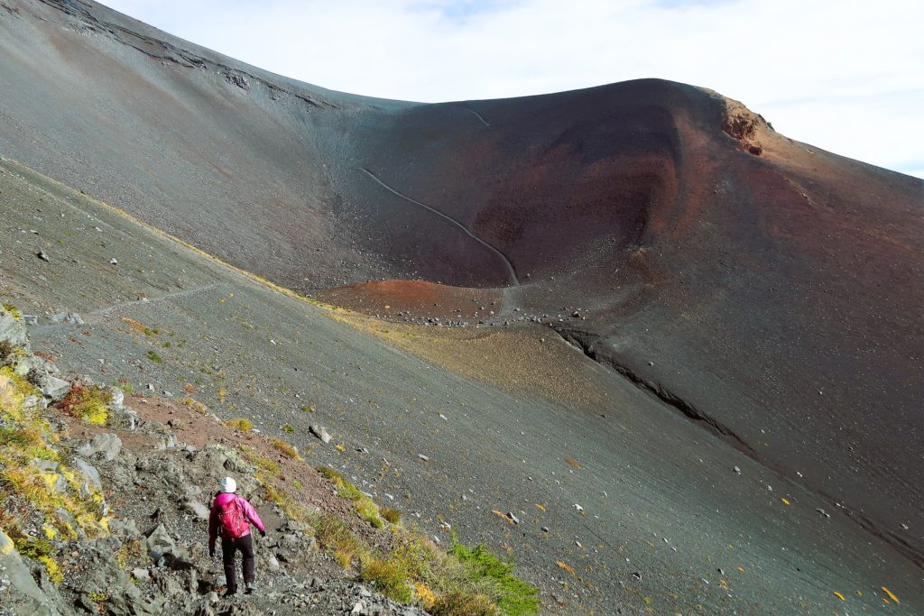 度々、突風が襲ってきますが「稜線を抜けて火口に入れば少し収まるかも…」と、期待を胸に頑張って進んでみます。