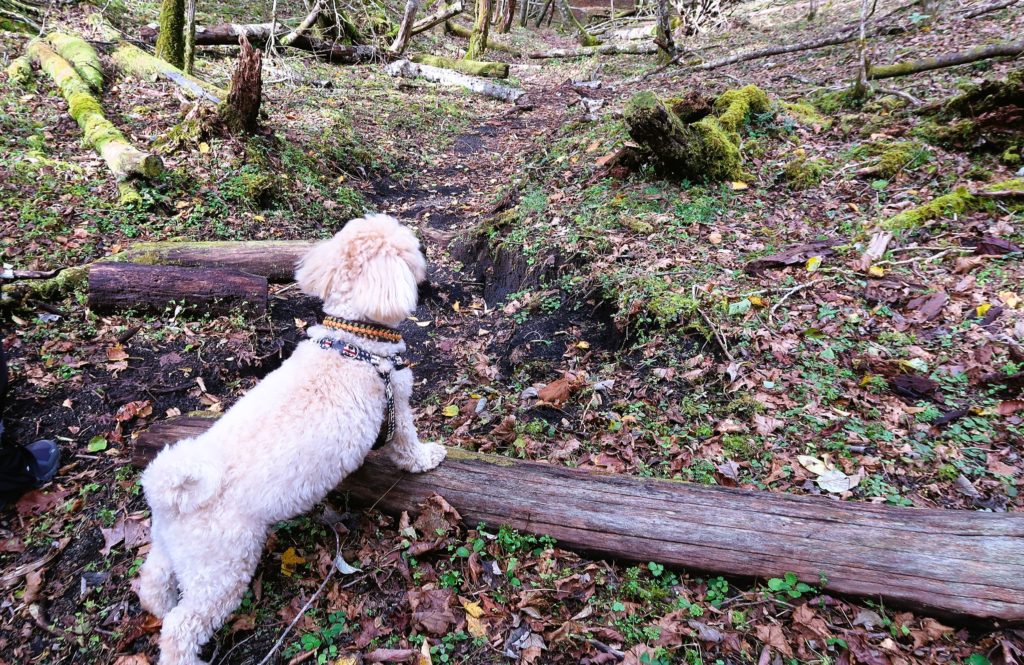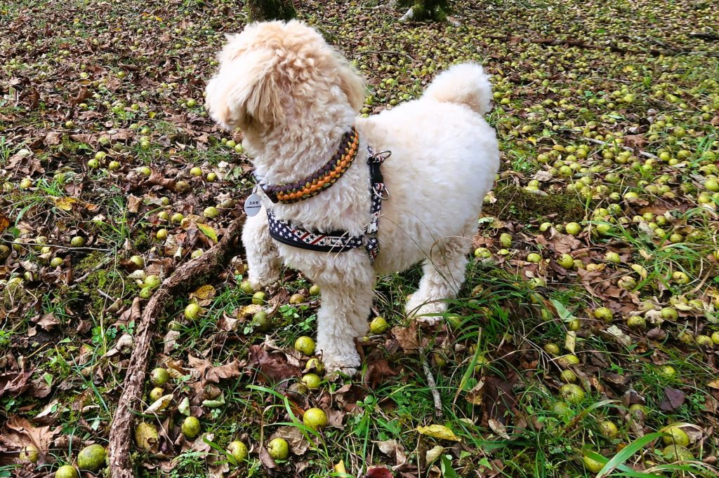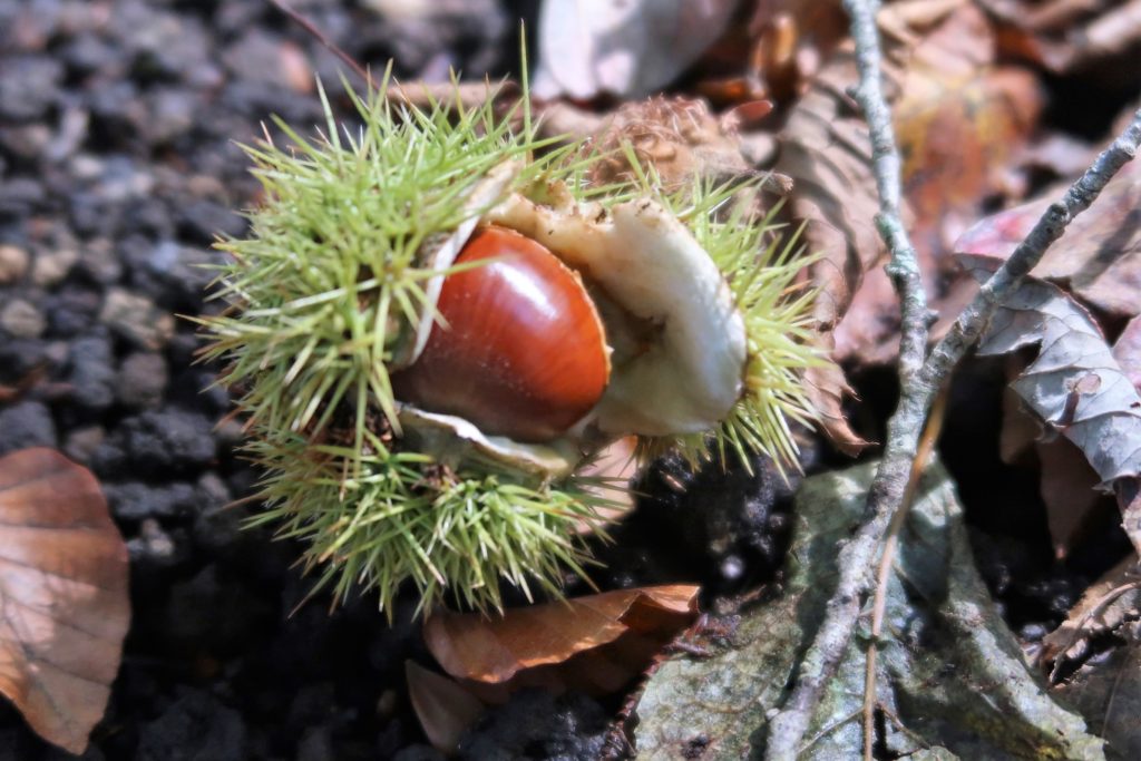 熟した山栗がたくさん転がっていて、裸足のエルモはイガを踏んでしまうたびにピョンピョンして、歩きずらそうです。