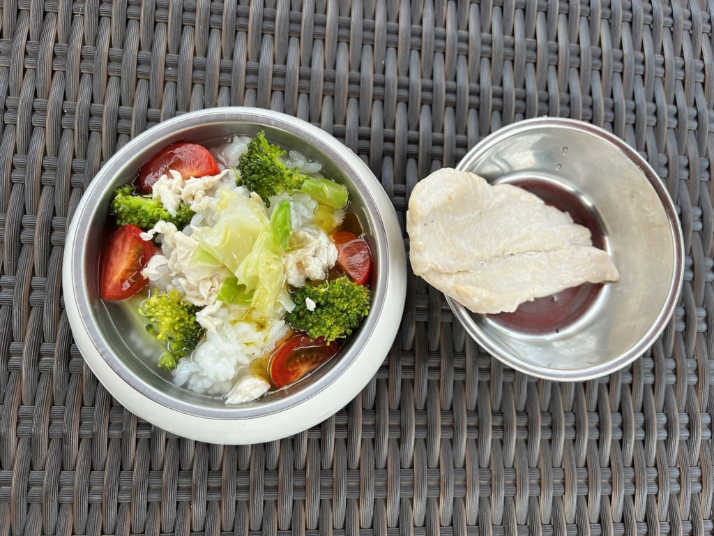 ワンちゃんメニューは、野菜たっぷりのリゾット風。鶏ささみジャーキーは、茹でたささみのようで柔らかく、手で簡単にほぐれます。