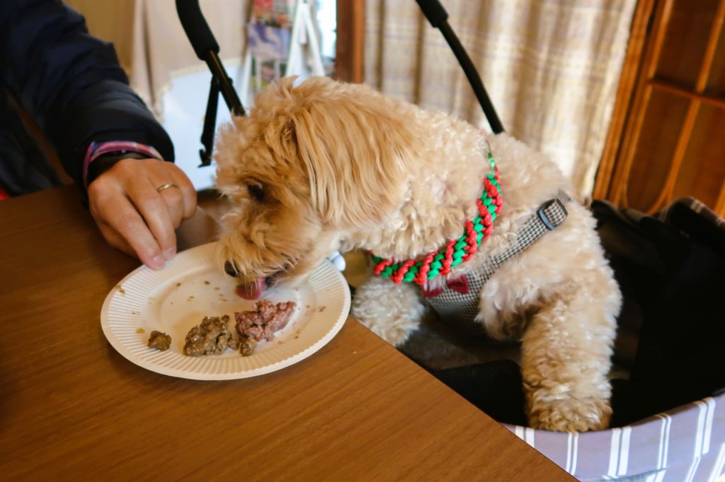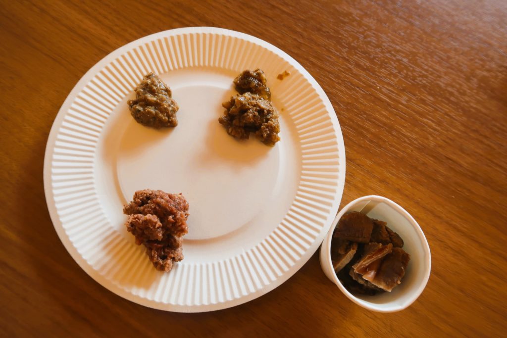 エルモが注文したのは、ドイツのお肉屋さんが作ったナチュラルフード『テラカニス』の3種盛り合わせ「わんこプレートSサイズ(200円)」と、寄で獲れた鹿肉を茹でてカットした「森のおにく(150円)」。
