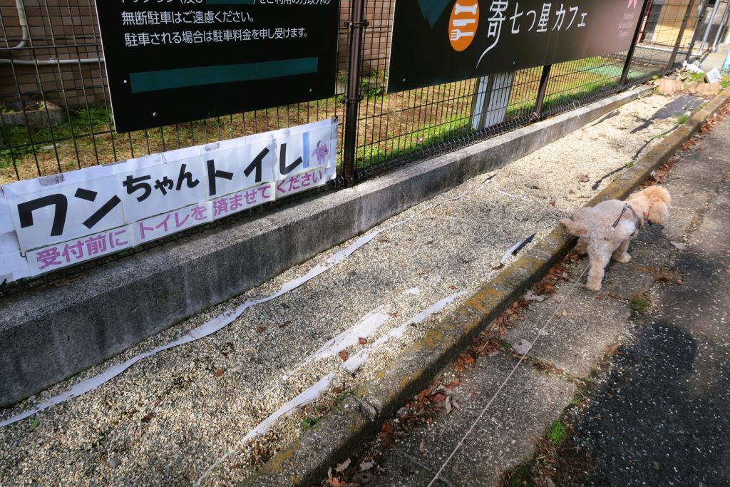 入口脇にワンちゃん用トイレスペースが設けられており、「受付前にトイレを済ませてください」と、書いてあったのでまずはトイレに立ち寄りましょう。