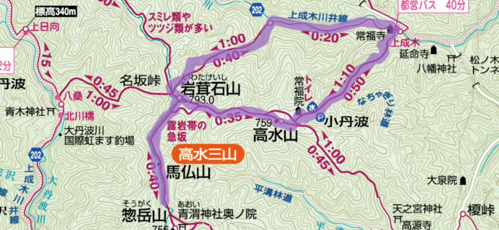 東京都青梅市にある山で、高水山・岩茸石山・惣岳山の3つが高水三山と呼ばれています。
