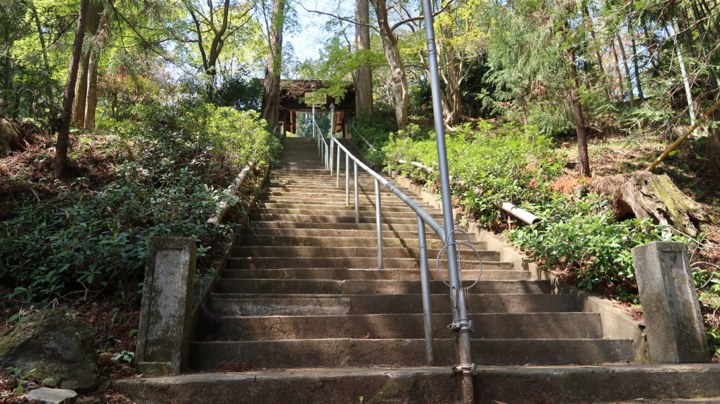 「これより10分」に励まされ、なちゃぎり林道を渡って登山道を登って行くと、常福院への階段がありました。