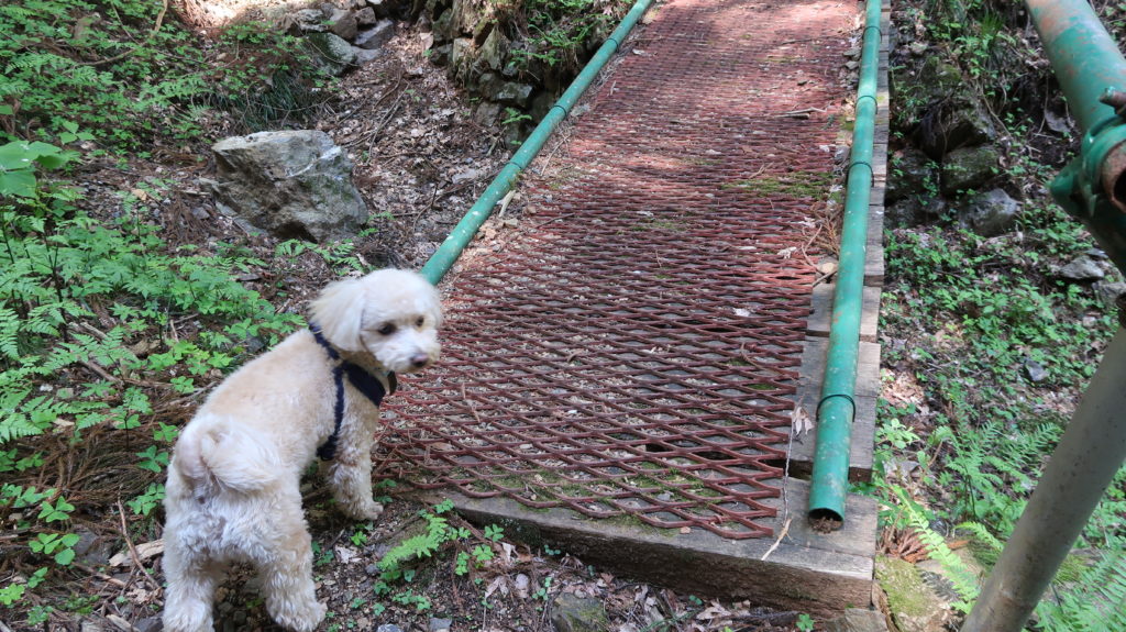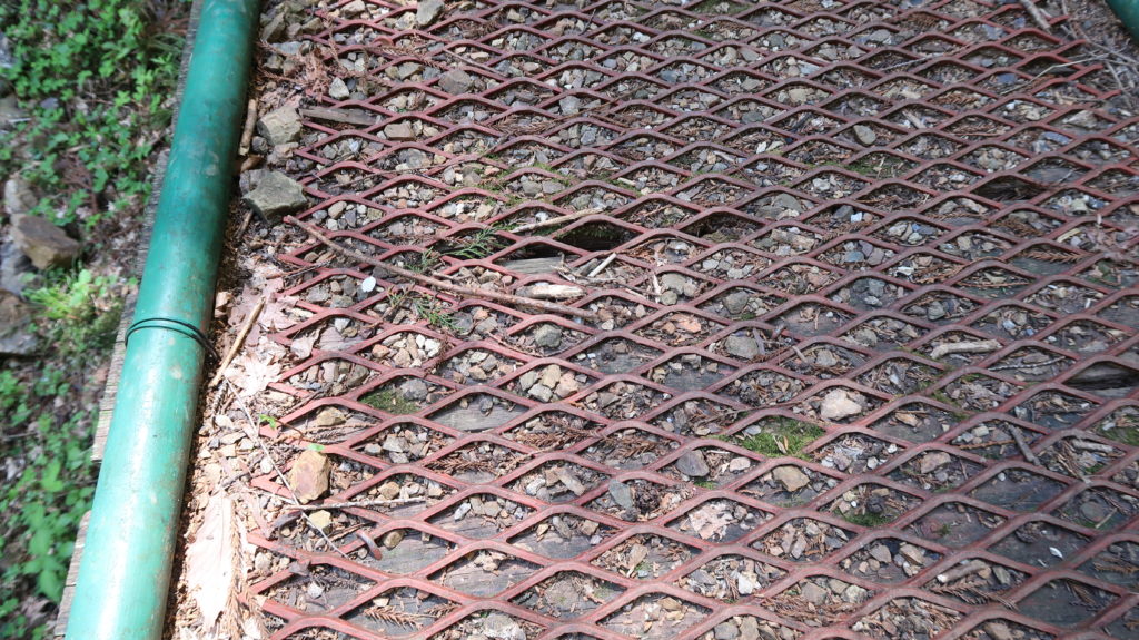 高水山に向かう途中の水場の橋。滑り止めの為と思われますが、金網状になっています。