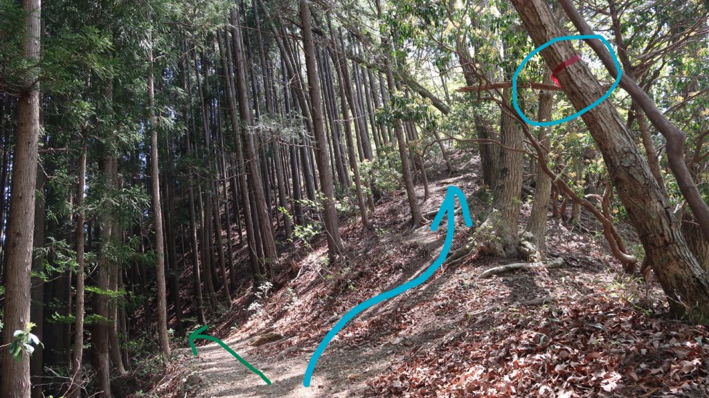 露岩帯から緩やかな山道に変わった辺りから注意深く確認しながら歩いていくと、右手に赤いテープが巻いてある木があります。
