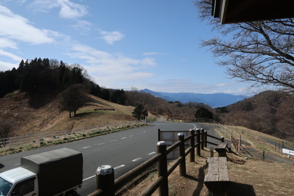 展望台下の案内板に沿って「粥仁田峠」方面へ、車道を少し下って行きます。