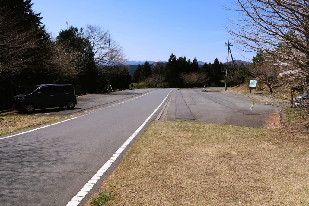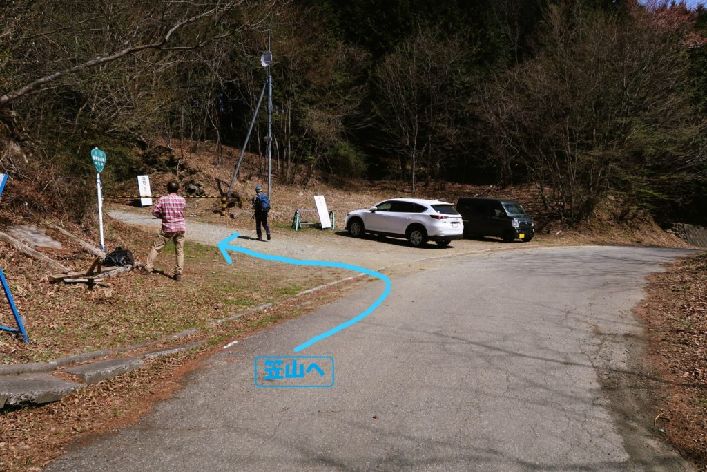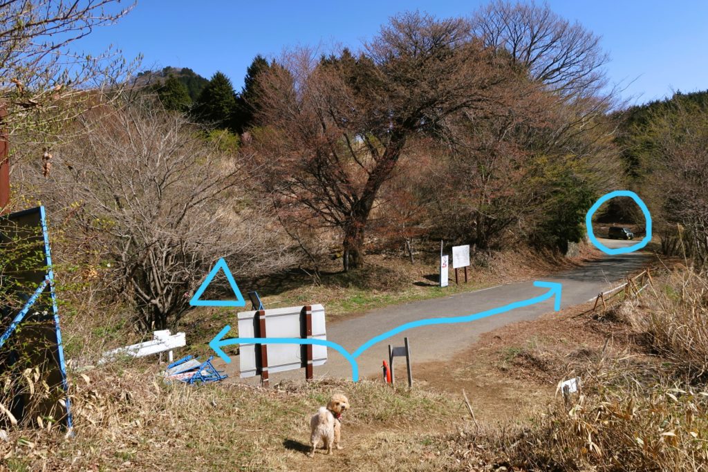 「○」の方へ進むと駐車場と登山道入口がある