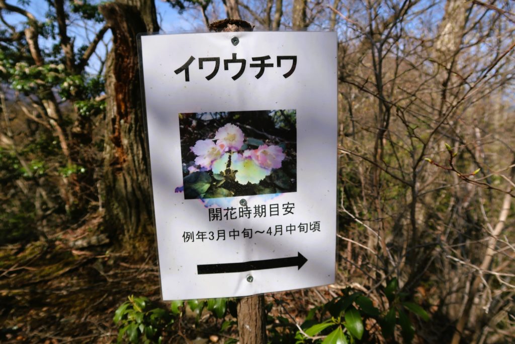岩場を越えて山道になったところに、なにやら花の看板が立っています。
