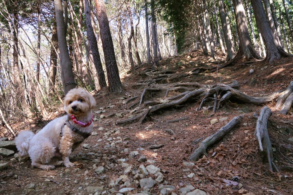 森の中を進んで行きます。ゴツゴツした木の根っこがはびこる急な登りがあったり…