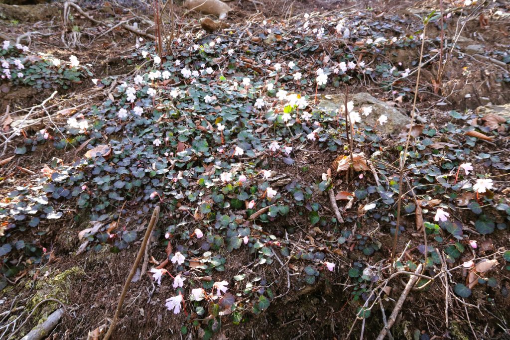 「イワウチワ」の群生地。結構な急斜面に咲いています。