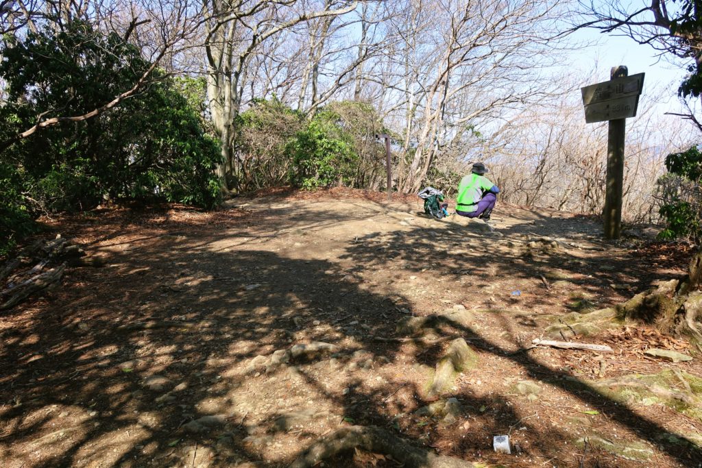 山頂のスペースは小さめで、細い木々が生い茂っていますが、眺望も一部望めます。
