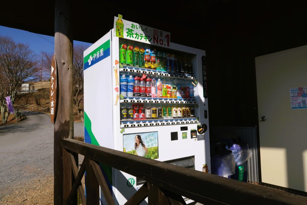 自動販売機は、トイレの向かい側の建物『林業体験施設』の前にありました。