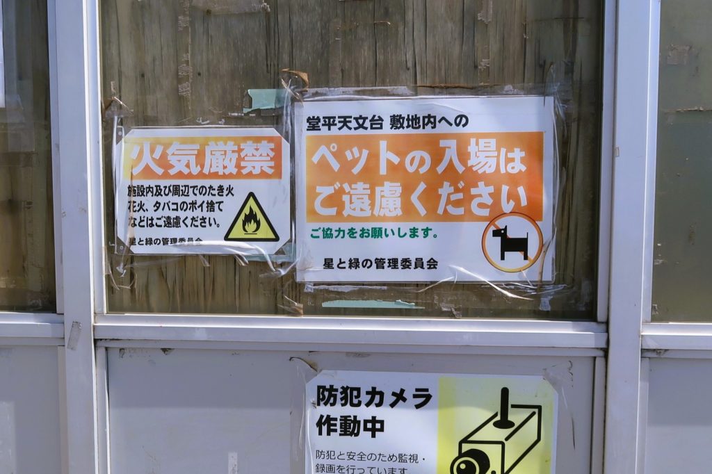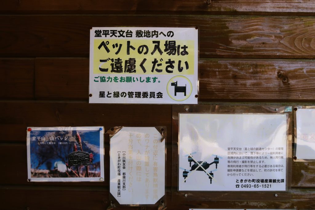 しかし、堂平山山頂・天文台、「星と緑の創造センター」は、建物内だけでなく敷地すべてがペット立入禁止となっています。