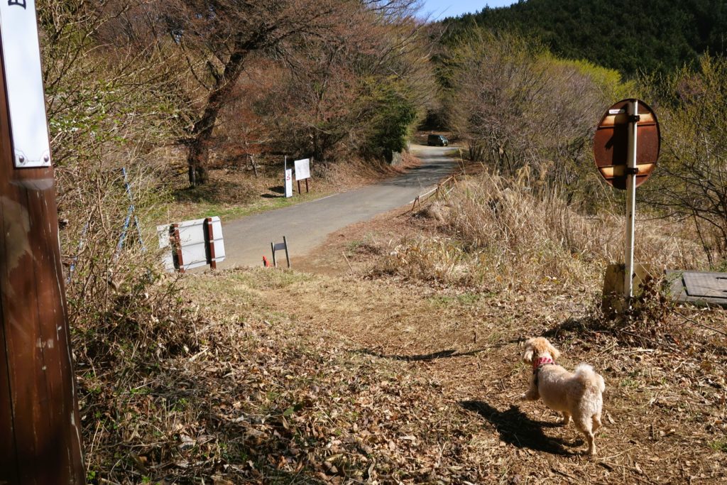 しばらく進むと先程の車道と合流しました。少し先に登山道に入るポイントがあります。