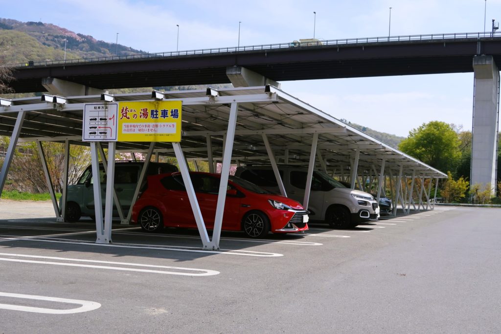 次の日の朝、キャンプ場を出てお隣の「梵の湯」駐車場に車を移動しました。