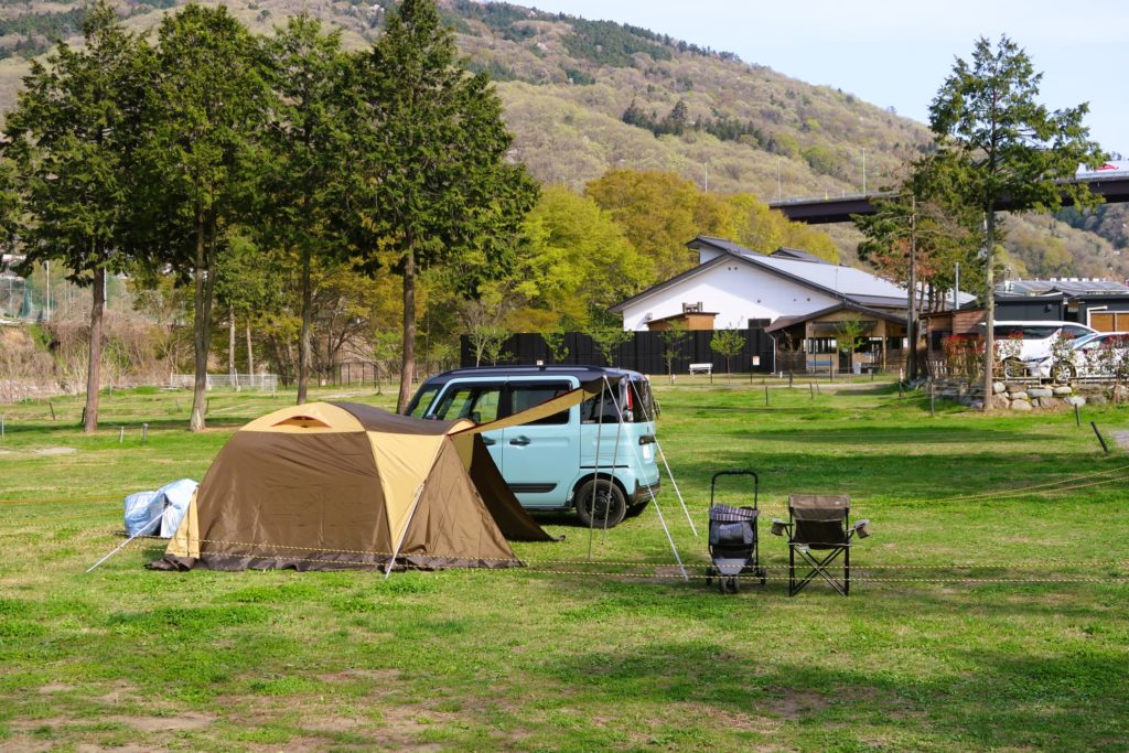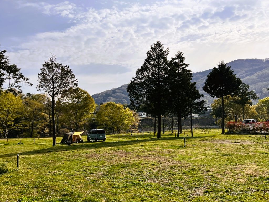 埼玉県秩父市、緑の芝生が美しい7000坪の広大な敷地のオートキャンプ場。