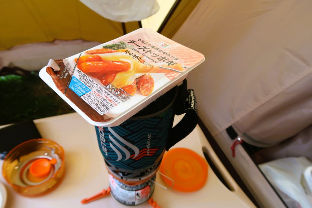 夕食は、コンビニで買ったおにぎりと冷凍食品をジェットボイルの蒸気で温めたもの。