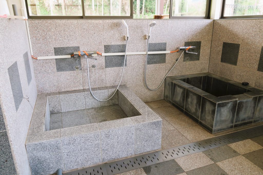 蛇口から温泉が出てくるので、温度を調節してお湯をためていきます。