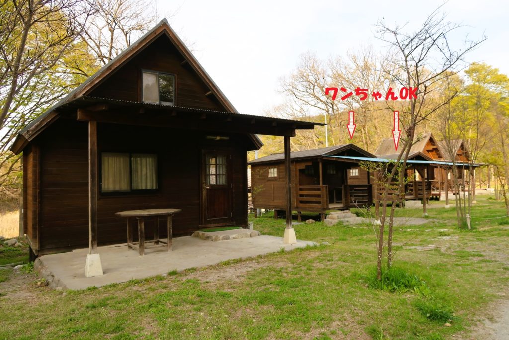 大きなバンガローは6人用、中央の2棟がワンちゃんOK、右側2棟はロフト付きだそうです。
