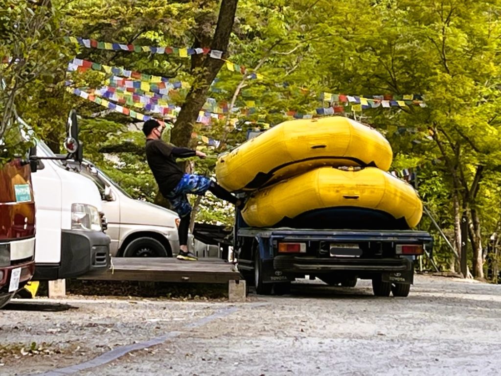 夕方になると、ラフティングを終えて引き揚げてきたボートの片付けをするスタッフの姿が見られます(^^)