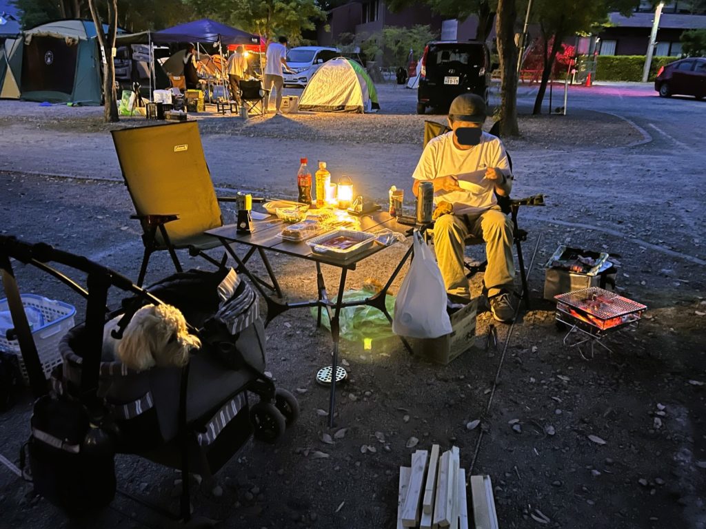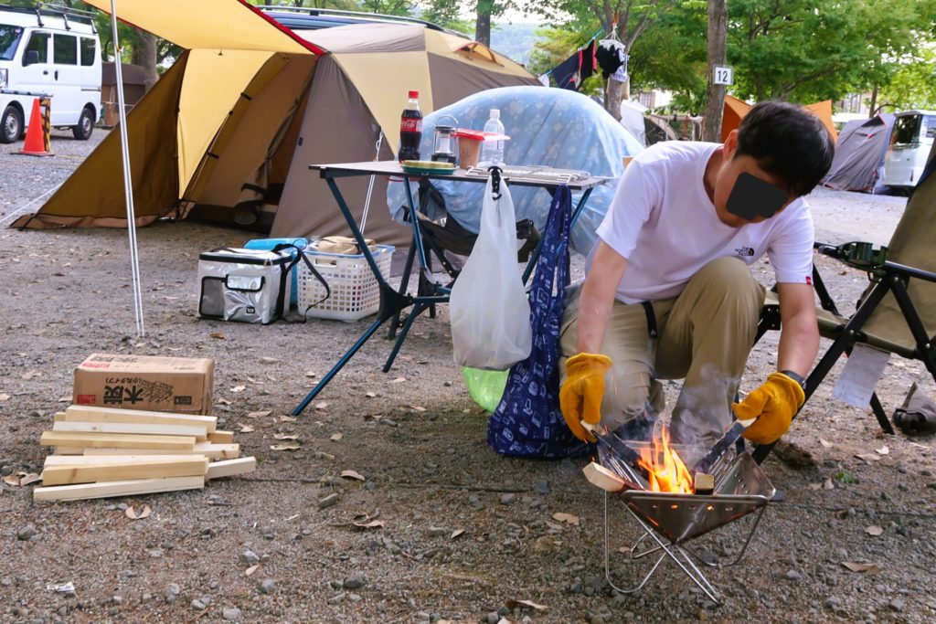 テント設営が終わったら、買ったばかりのスノーピークの焚火台で火をおこしてみます。
