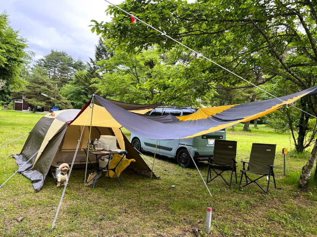 古タープを木2ヶ所と車のルーフバー・テントタープのポールの4点で支えて完成。