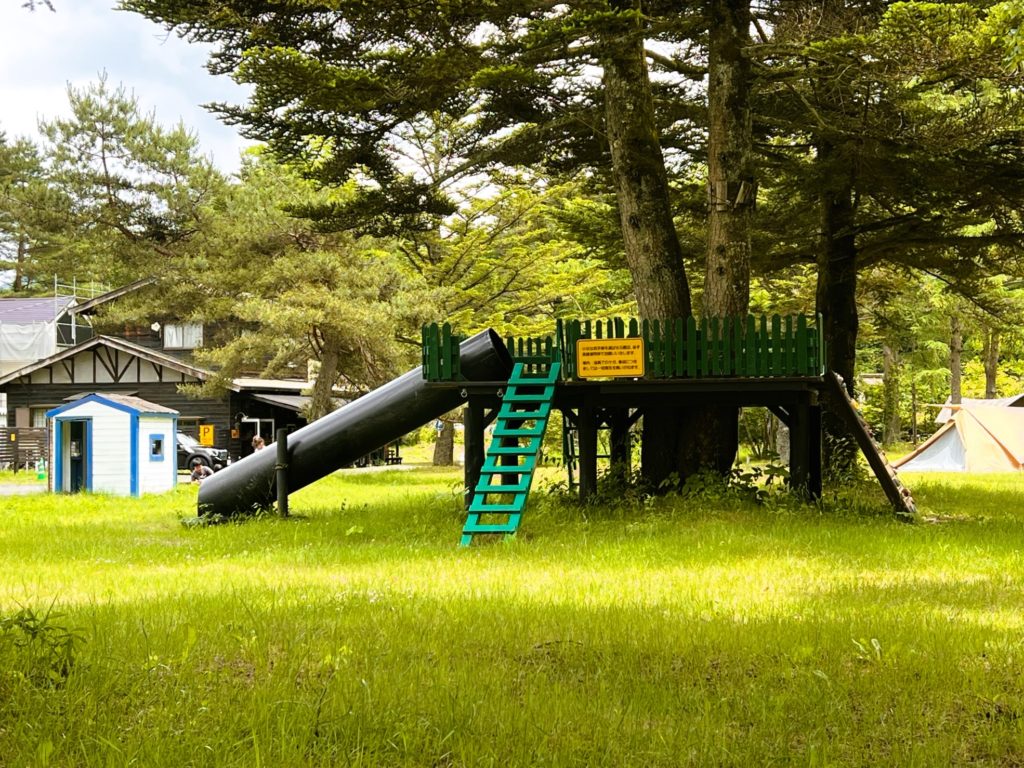 広々とした芝生エリアに、ツリーハウスのすべり台と砂場があります。