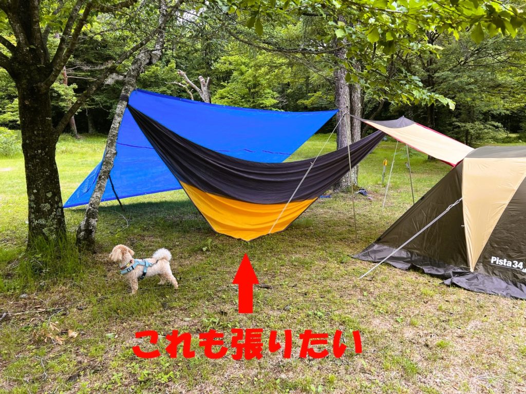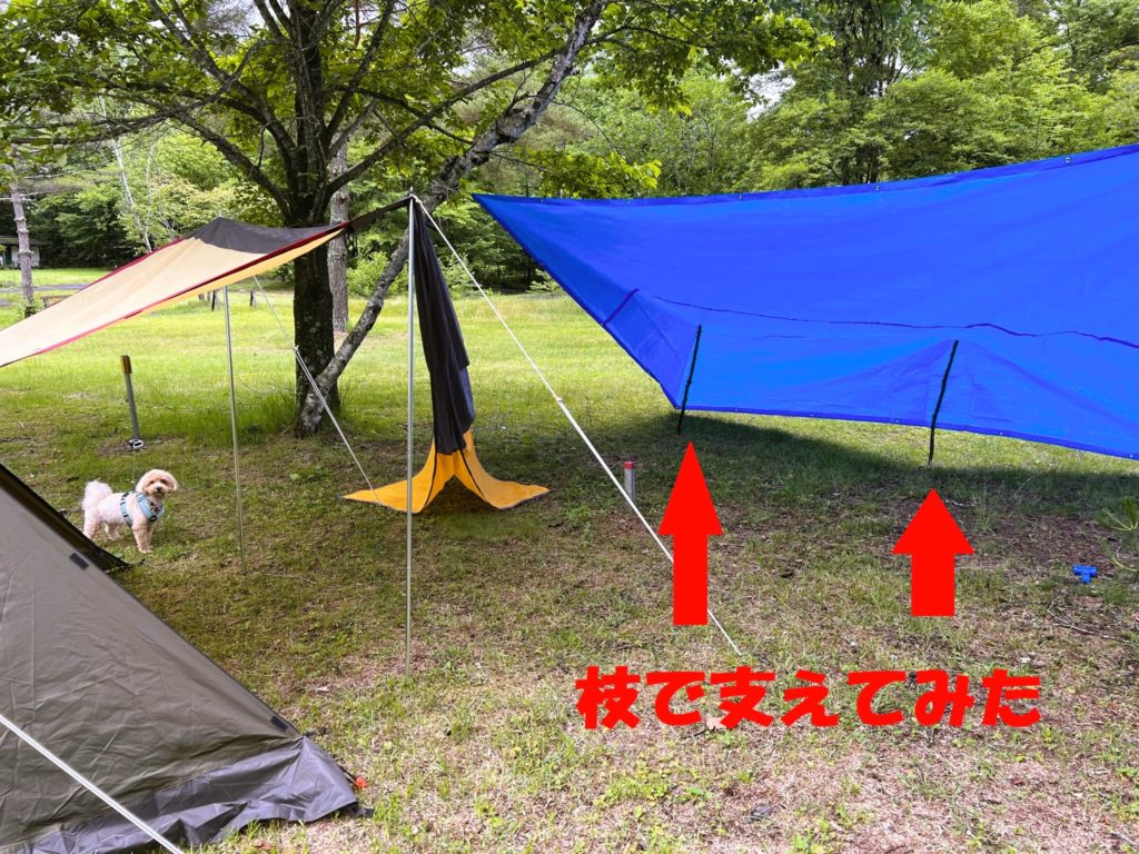 サイト両側の木を利用してブルーシートを張ってみるものの、素材が重すぎる感じ。