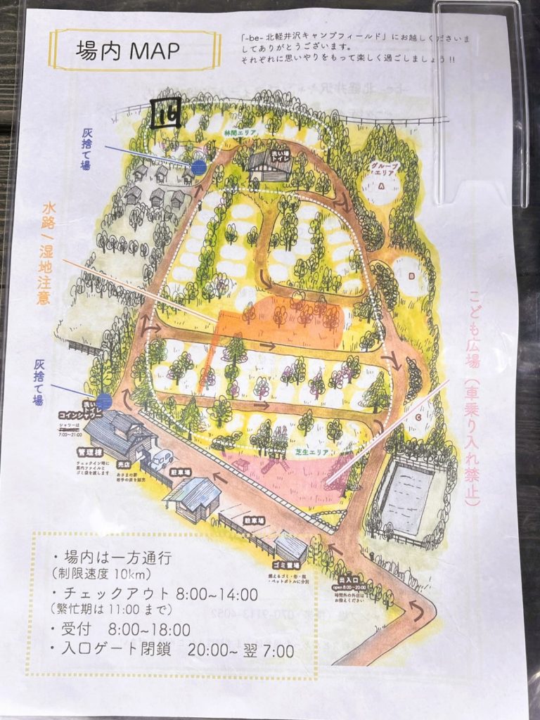 場内は、中央が芝生エリア、外側に森林エリアとグループエリアがあり、トイレと炊事場は2ヶ所、シャワーは1ヶ所です。