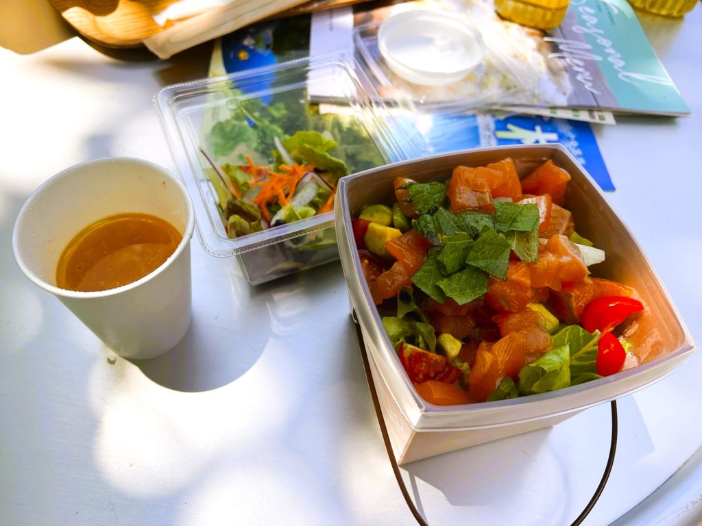 今回注文したのは、「信州ビーフカレー(1,200円)」と「サーモンポキ(1,600円)」にスープとサラダのセット(350円)。