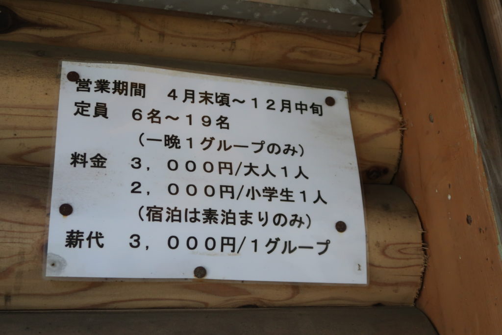 東雲山荘の宿泊は、4月末頃~12月中旬まで。素泊まりのみで予約が必要です。