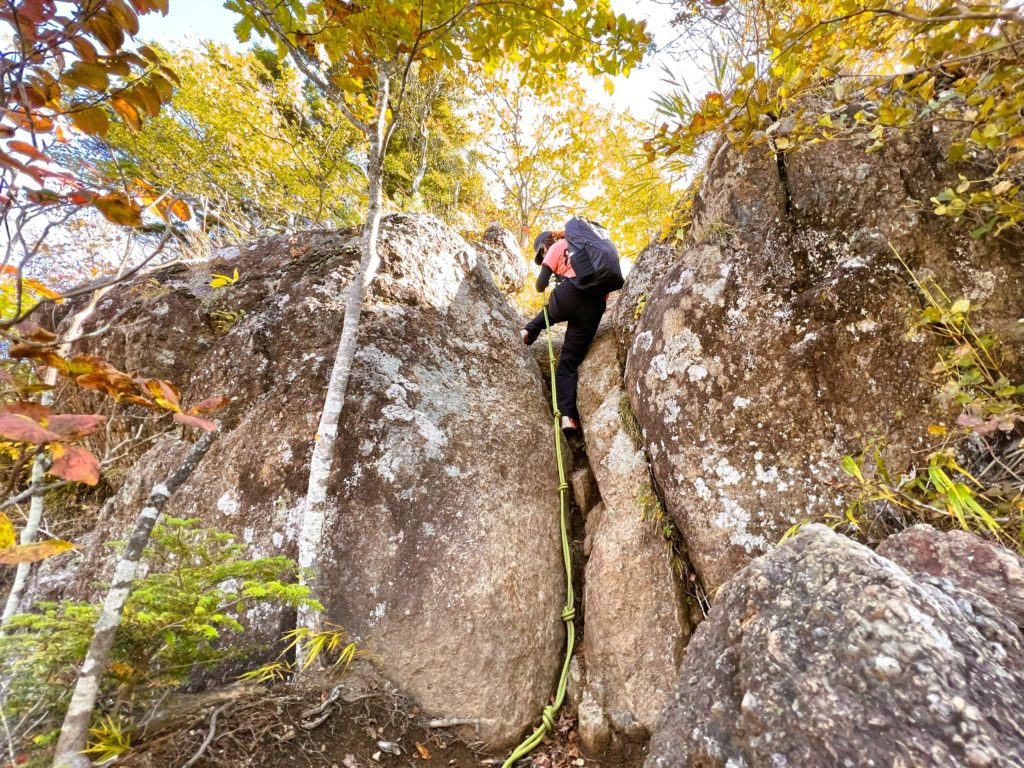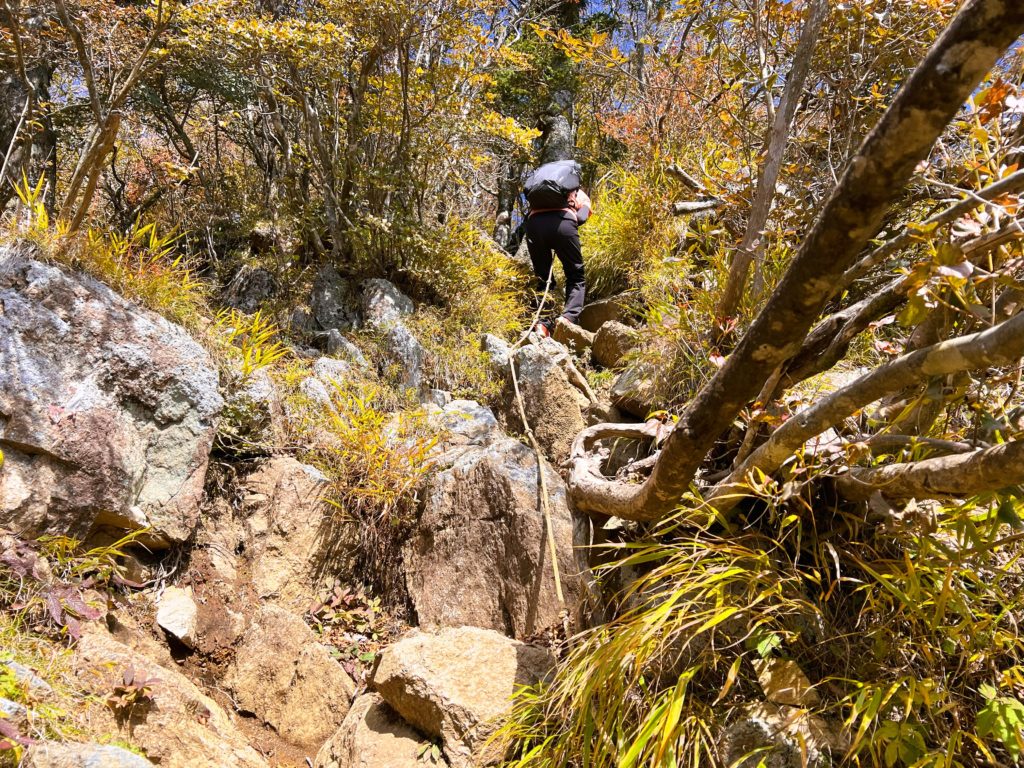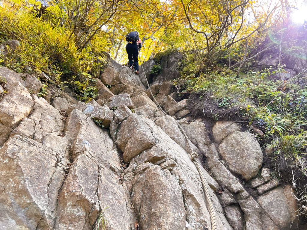 山頂直下しばらくは、こちらもロープありの険しい岩場となっています。