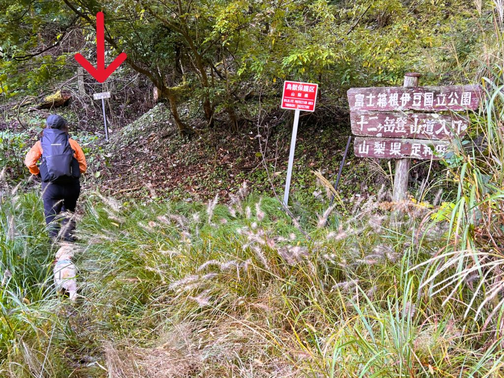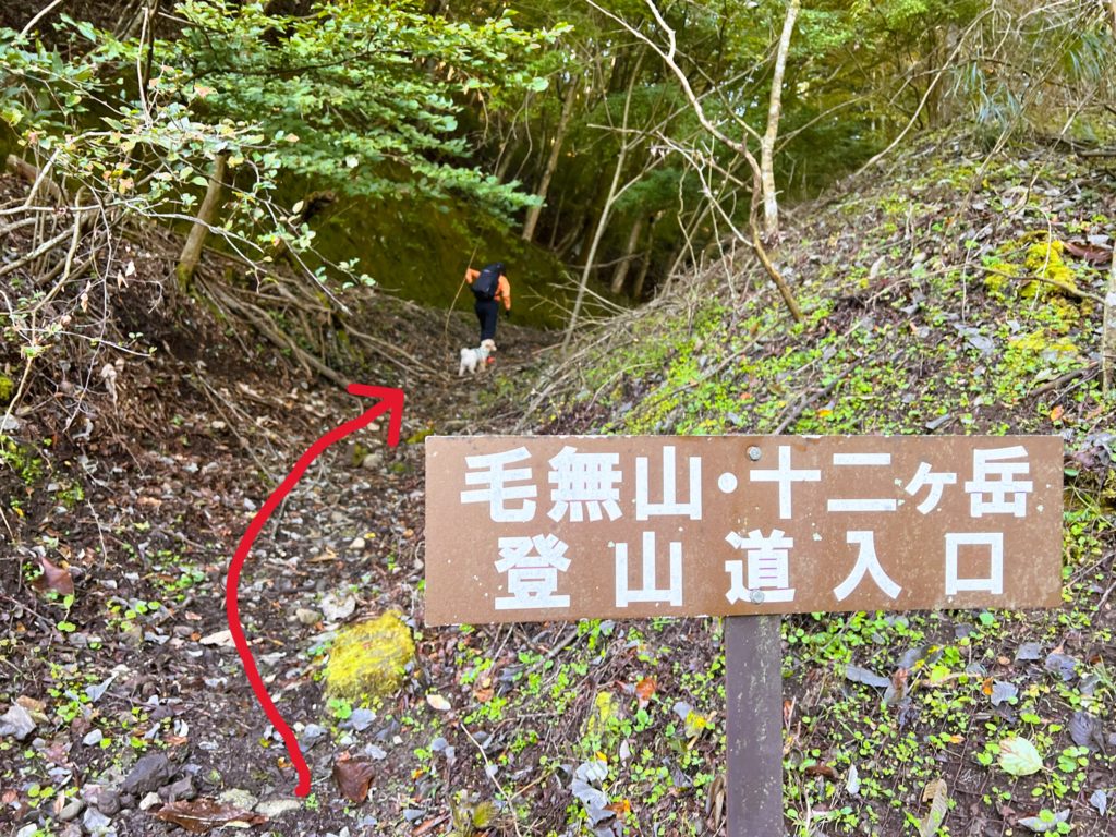 看板の先に「登山道入口」の案内板があり、ここから登山道へと入って行きます。