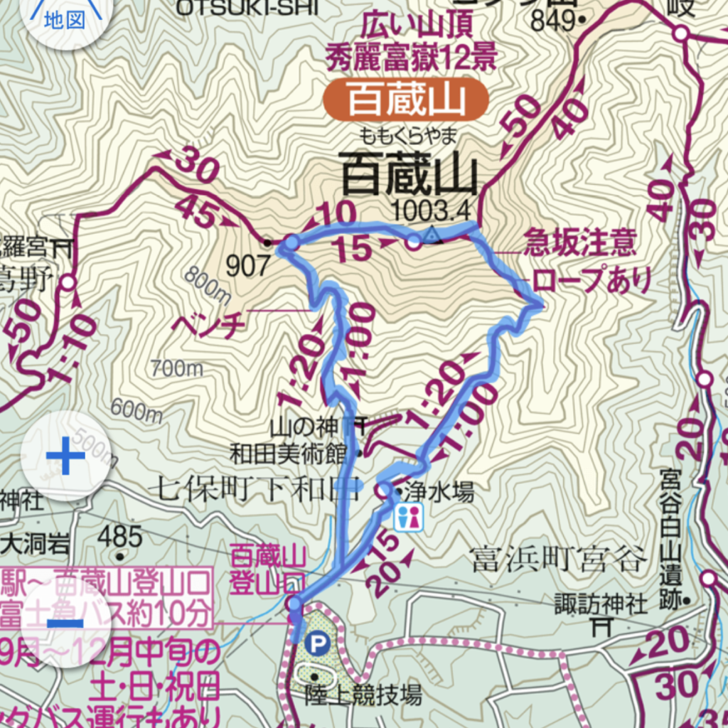 大月市営総合グラウンド駐車場→(西ルート)トトロの広場→百蔵山山頂→(東ルート)浄水場