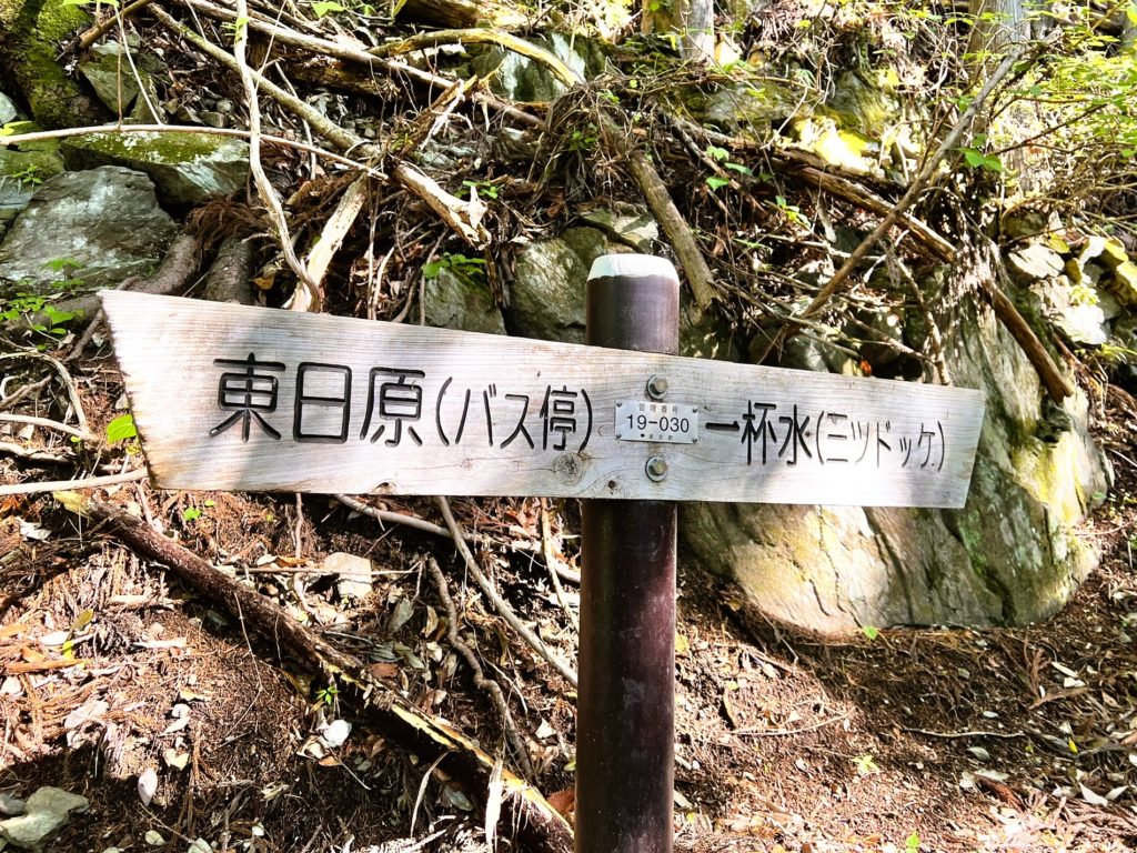 駐車場から車道を通って、まずはトイレのある『東日原バス停』を目指します。