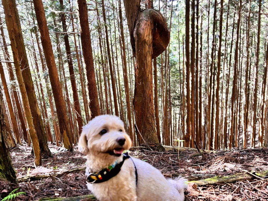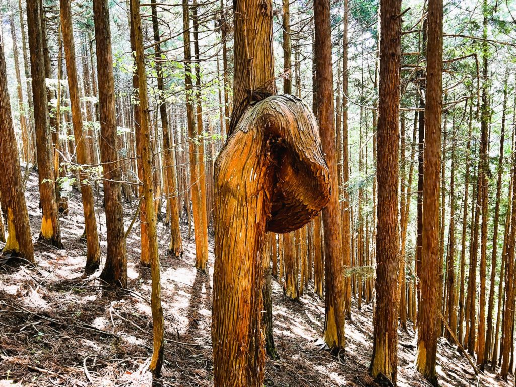 枯葉が積もる登山道がやっと終わった…と、ひと息ついたころ、有名な「ぐるっとした木」に出会えました。