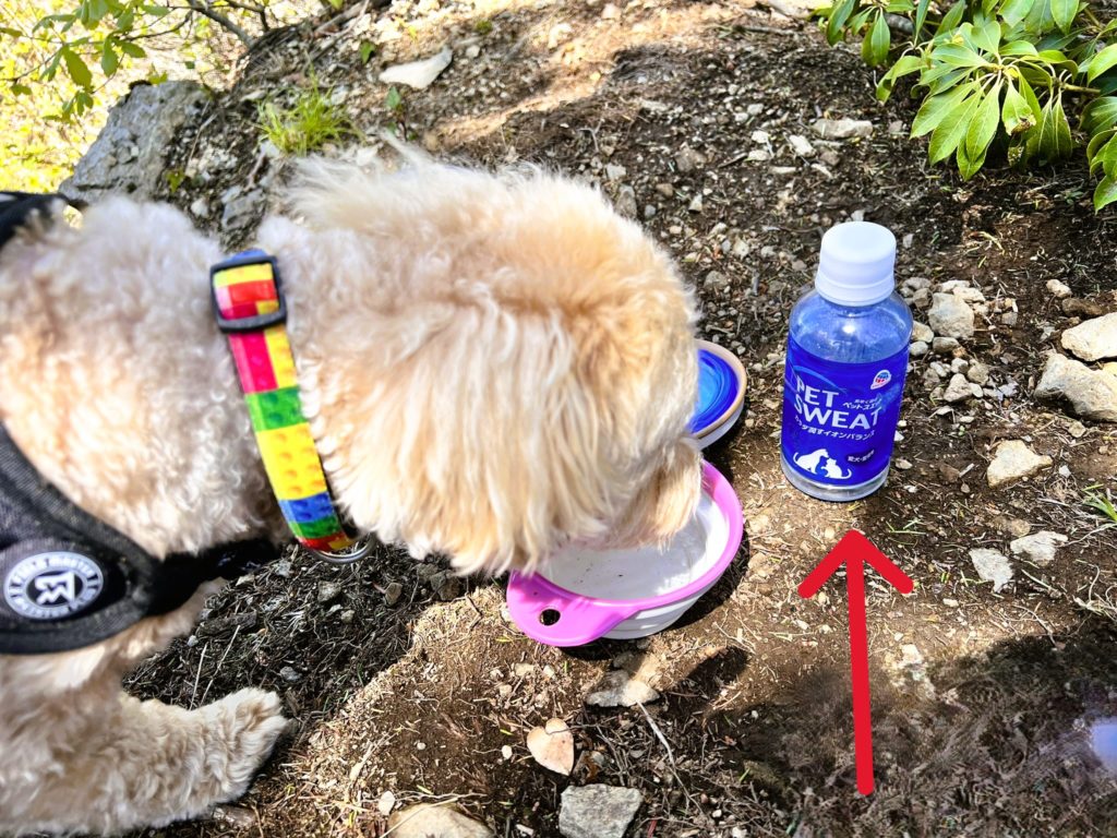 やっと涼しい場所を見付けて落ち着いたようなので、犬用スポーツドリンク、その名も「ペットスエット」で、ホッと一息休憩タイム♬