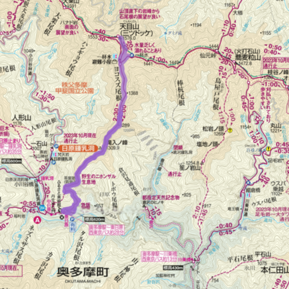 『ドッケ』とは突起のことです。3つのピークを持つため「三ツドッケ」という別名があり、奥多摩側では「天目山」、秩父側では「三ツドッケ」と呼ばれています。